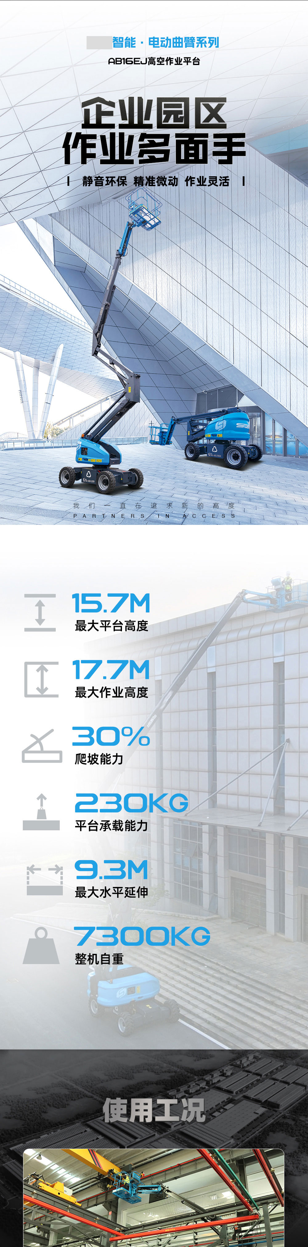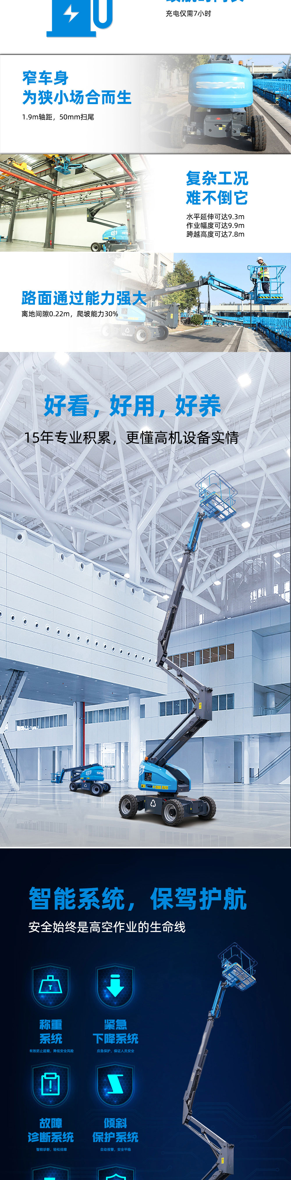 稱重230kg,爬坡30%,水平延伸9.3m,作業高度17.7m,純電動不制造煩人噪音,靜音施工零排放,適應室內作業,全國連鎖,售后無憂,24h銷售維保在線,在線咨詢優惠多多!
